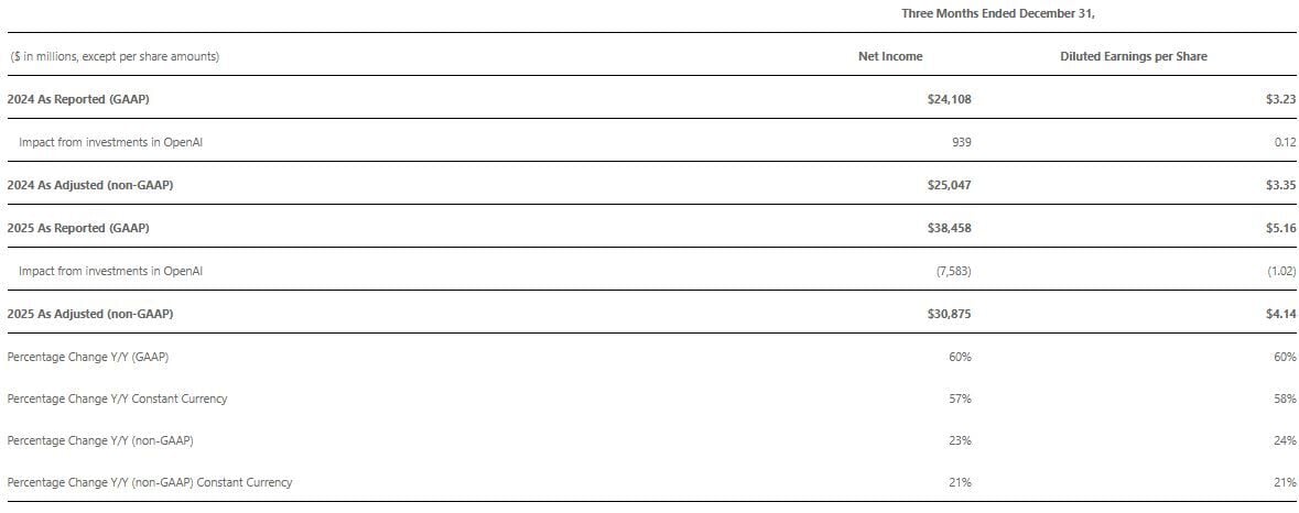 Las acciones de Microsoft bajan un 5,7% antes de la apertura de Wall Street después de que la empresa presentase anoche tras el cierre sus cuentas trimestrales. En el segundo trimestre fiscal, que finalizó el 31 de diciembre, los ingresos de Microsoft crecieron un 16,7% interanual hasta los 81.270 millones de dólares. El beneficio neto alcanzó los 38.460 millones de dólares, o 5,16 dólares por acción, frente a los 24.110 millones de dólares, o 3,23 dólares por acción, del mismo trimestre del año anterior. Las ganancias ajustadas, que excluyen el impacto de las inversiones en OpenAI, fueron de 4,14 dólares por acción, frente a los 3,97 dólares por título esperados.