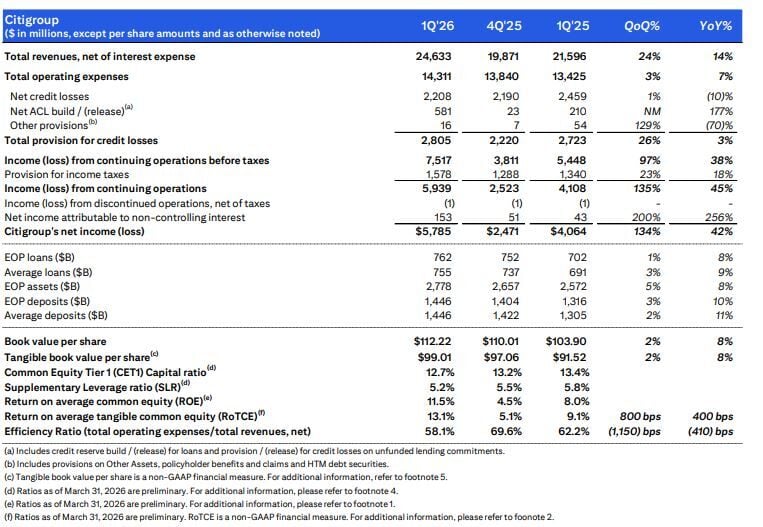 Citigroup alcanzó en el primer trimestre un beneficio de 5.785 millones de dólares, o 3,06 dólares por acción, un 42% más que en el mismo período del año anterior. Los ingresos aumentaron un 14% hasta los 24.633 millones de dólares. Los analistas habían anticipado 2,65 dólares de ganancias y 23.550 millones de ingresos.