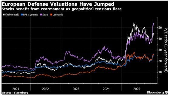 Tras un repunte masivo en el primer semestre de 2025, las acciones militares se han mostrado cada vez más sensibles a las noticias geopolíticas, ya que las altas valoraciones mantienen al mercado en vilo. Las acciones de Rheinmetall tienen un precio de más de 40 veces las ganancias esperadas dentro de un año, casi el doble del múltiplo observado hace un año.