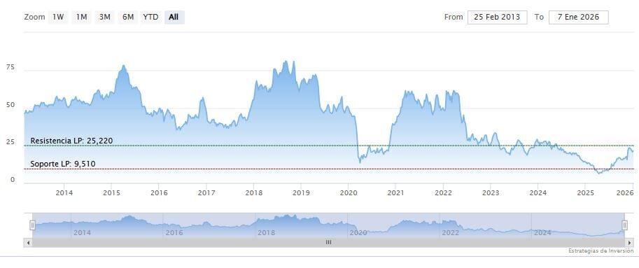 La resistencia a mediano y largo plazo se encuentra en los 25.22 dólares. Mientras, los indicadores de Ei se muestran mixtos.