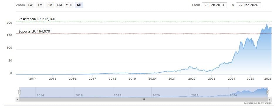 La resistencia a mediano y largo plazo se encuentra en los 212.16 dólares. Mientras, los indicadores de Ei se muestran mixtos.