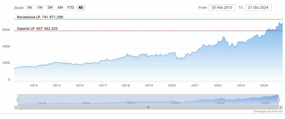 Berkshire Hathaway cerraba el mes a la baja en los 676.959 dólares. La media móvil de 70 periodos se encuentra sobre la vela del jueves, RSI a la baja en los 41 puntos y la línea rápida (azul) del MACD apenas debajo del nivel de cero.