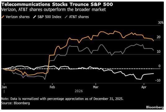 Tras un desastroso 2025, el sector de las telecomunicaciones es uno de los de mejor rendimiento este año en el índice S&P 500, con un aumento del 9.6%, mientras que el índice general acumulad ligeras caídas. Las acciones de Verizon Comm han subido más del 19% en 2026, y las de AT&T han ganado un 13%. Mientras tanto, el índice NASDAQ 100experimentó una corrección en marzo, y un indicador de Bloomberg de los siete gigantes tecnológicos ha caído un 13% desde su máximo de octubre.