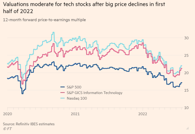 Además, las caídas del primer semestre solo han fortalecido el atractivo del sector tecnológico, dicen los optimistas. El sector de tecnología de S&P cotizó con un múltiplo de precio a ganancias a 12 meses de 28 veces a principios de enero, pero había caído a 19.2 a fines de junio, según estimaciones de Refinitiv. Incluso con las ganancias recientes, se cotiza solo con 21.2 veces las ganancias futuras.