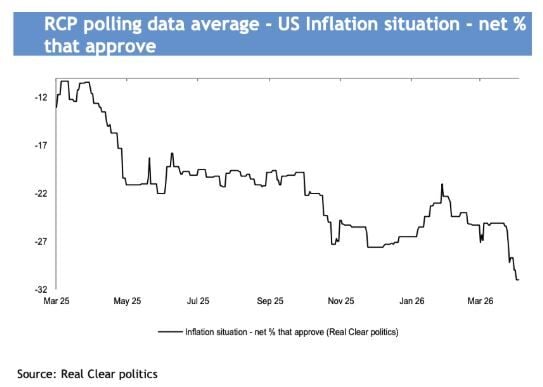 Otro gráfico detalla el declive de la aprobación del estado de la economía estadounidense. La preocupación por la inflación también ha vuelto a ser prioritaria para los consumidores, con un aumento vertiginoso de los precios de la gasolina en todo el país.