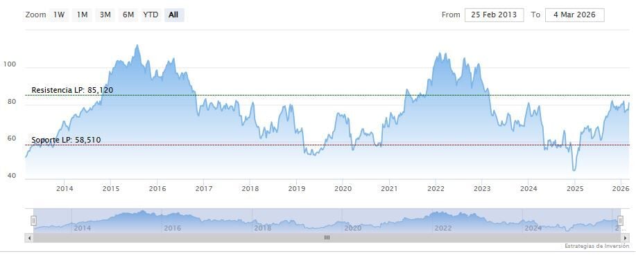 La resistencia a mediano plazo se encuentra en los 84 dólares. Mientras, los indicadores de Ei se muestran mixtos.