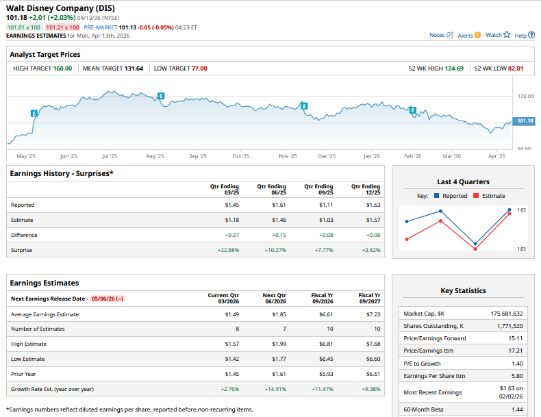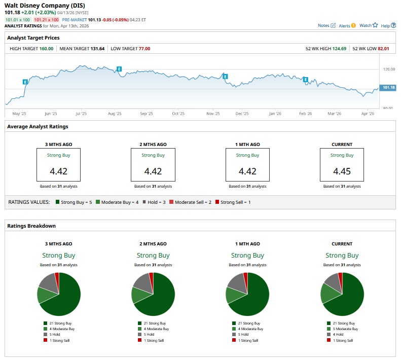 Los analistas de Wall Street también se muestran bastante optimistas con respecto a Disney, y 26 de los 31 analistas encuestados por Barchart la califican como "Compra" o equivalente. 4 analistas recomiendan "Mantener", mientras que 1 le ha otorgado una calificación de "Venta fuerte". El precio objetivo medio de las acciones es de 131.61 dólares, lo que supone un 30% más que el precio actual.