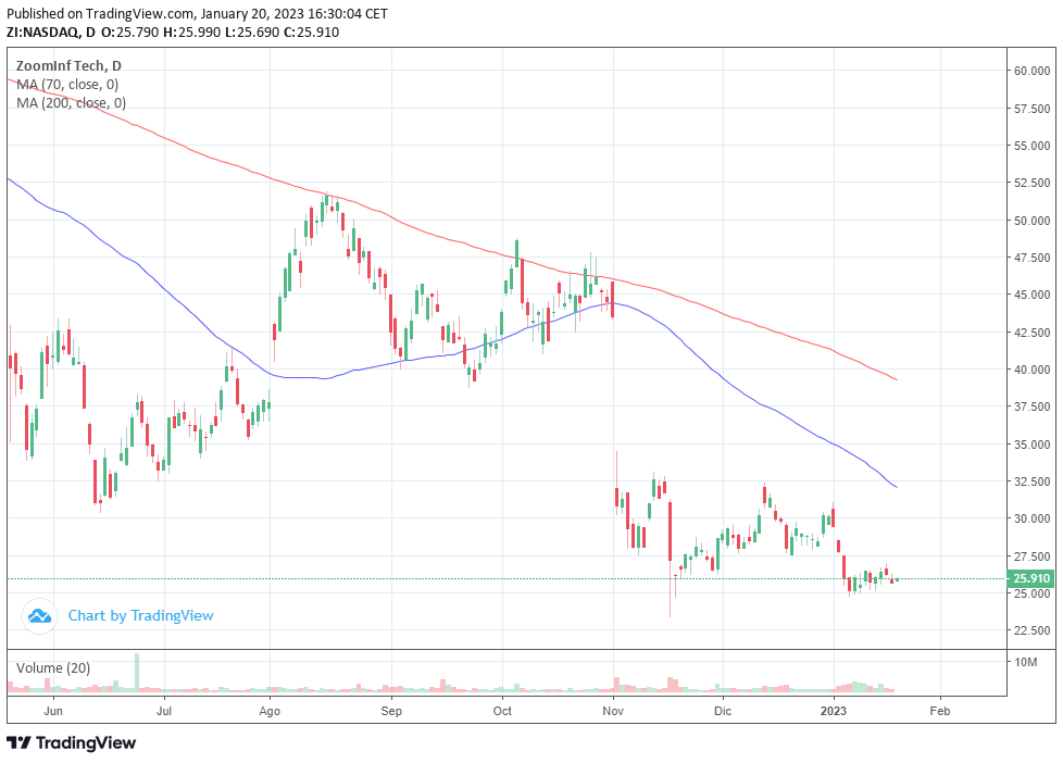 ZoomInf Tech cotiza en los 25.89 dólares y las medias móviles de 70 y 200 periodos se mantienen por encima del precio.