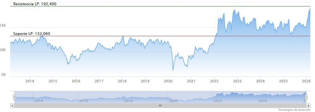 Las acciones de la petrolera vienen de tocar un máximo en 192,41 dólares el pasado 6 de marzo, con una ligera corrección el 1,5% desde entonces. Suben un 24,3% en lo que va de 2026 y un 43,4% desde sus mínimos de abril del año pasado (132,04 dólares). De cara al futuro, los analistas fundamentales dan a Chevron una recomendación mayoritaria de ‘comprar’, según los datos recogidos por Reuters. No obstante, igual que en el caso de Exxon, el precio objetivo de 185,97 dólares está por debajo ya de la cotización actual (-1,83%).