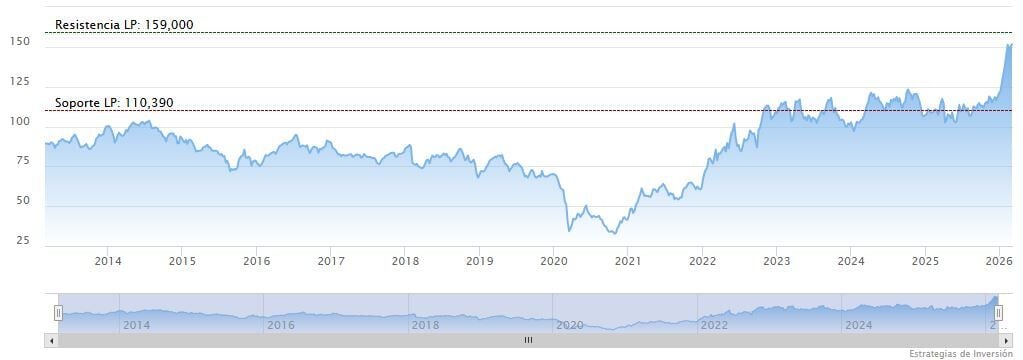 Tras este buen comportamiento, los analistas fundamentales ven el potencial agotado de momento, a la espera de si hay alguna revisión. Si bien la recomendación mayoritaria sigue siendo de ‘comprar’, de acuerdo con los analistas de Reuters, el precio objetivo medio, de 145,31 dólares por acción, está un -3,41% por debajo de la cotización actual.