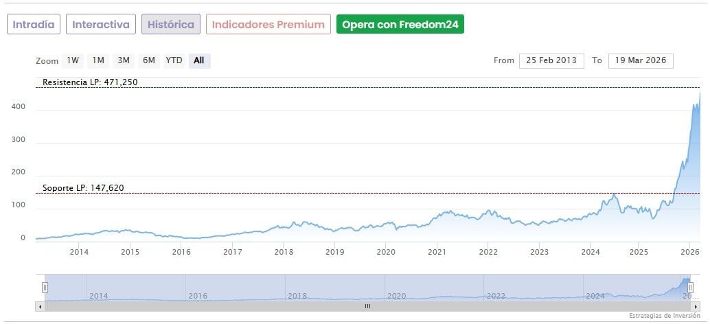 Las acciones de Micron han experimentado un fuerte repunte en los últimos años. Se triplicaron en 2025 y han subido otro 55,6% en lo que va del año, acumulando una revalorización de nada menos que un 622% desde sus mínimos de las últimas 52 semanas, de abril del año pasado (61,54 dólares). El pasado 18 de marzo tocaron un máximo de 471,38 dólares, habiendo corregido un 5,74% desde entonces.