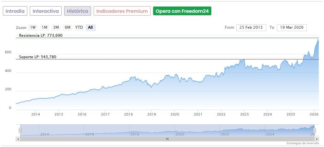 Northrop conquistó máximos históricos el 3 de marzo (en los inicios de la guerra de Irán) en 774 dólares, habiendo corregido un 7,7% desde entonces. Pero las acciones todavía suben un 25,24% solo en lo que va de 2026 y un 45,3% en los últimos 12 meses.