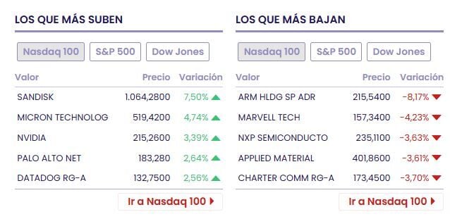 Entre las acciones ganadoras tenemos a Sandisk (+8.12% a 1.070,25 dólares), Albemarle (+5.97% a 199.57 dólares) y NVIDIA (+4.00% a 216.61 dólares)