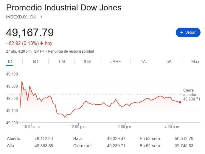 La última semana de abril empieza bajo el conflicto en Medio Oriente. En este caso, Irán ha presentado una propuesta para reabrir el Estrecho de Ormuz y poner fin al conflicto con Estados Unidos e Israel. Por otro lado, los analistas e inversores estarán atentos a la próxima reunión de la Reserva Federal (la ultima a cargo de Jerome Powell) y se espera que no haya cambios. Ante ello el DOW JONES Ind Averagecierra a la baja en un -0.13% a 49.167 puntos, mientras el S&P 500 y NASDAQ 100 cierran al alza en un +0.12% a 7.173 puntos y +0.20% a 24.887 puntos respectivamente.