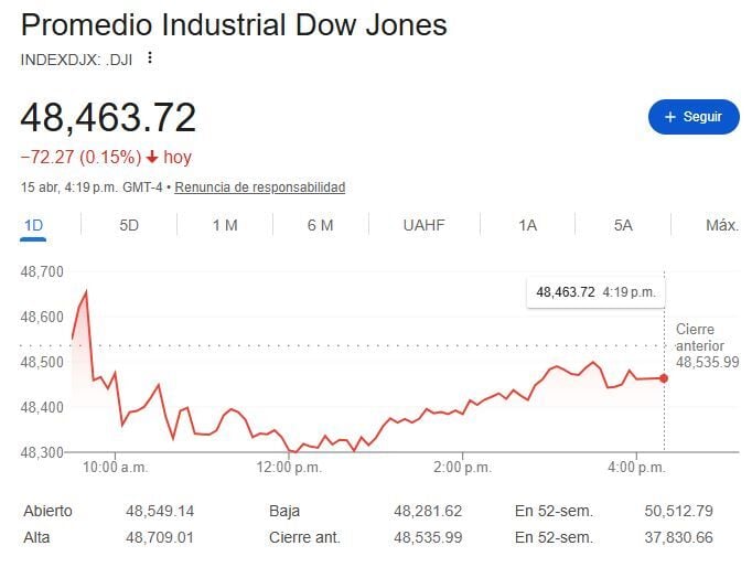 Las expectativas en torno a las conversaciones por el conflicto en Medio Oriente entre EE.UU. e Irán, lo que trajo algo de alivio a los mercados financieros. No obstante, el DOW JONES Ind Average cierra la sesión del miércoles a la baja un -0.15% a 48.463 puntos, mientras el S&P 500 y NASDAQ 100 suben al final de la sesión un +0.80% a 7.022 puntos y +1.59% a 24.016 puntos respectivamente.