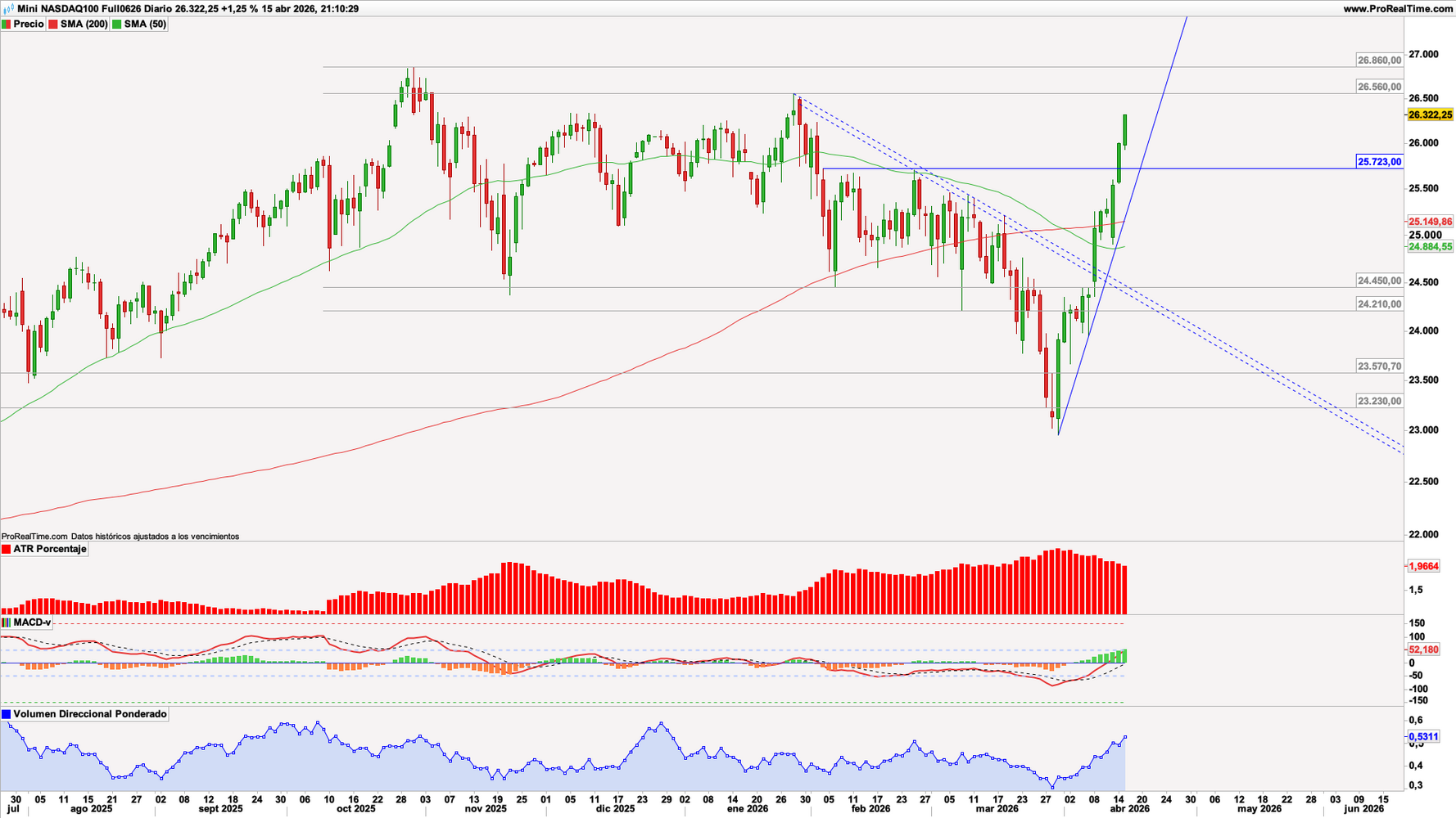 El Futuro Mini NASDAQ 100 (NQ) continúa su avance que se originó desde los mínimos del día 31 de marzo, recuperación en forma de V que le ha habilitado recientemente a superar el máximo decreciente identificado a la altura de los 25.723 puntos, movimiento ampliamente respaldado por (i) un incremento en el volumen direccional, así como (ii) por el oscilador de momento MACD-v, cuyas lecturas consolidan por encima de su banda neutral o cero.