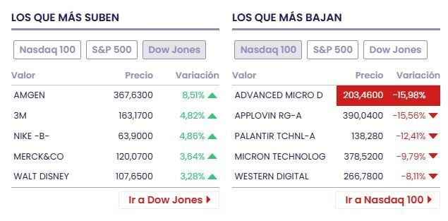 Entre las acciones perdedoras tenemos a AMD (-17.31% a 200.19 dólares), AppLovin Rg-A (-16.12% a 387.34 dólares) y NVIDIA (-3.41% a 174.19 dólares)