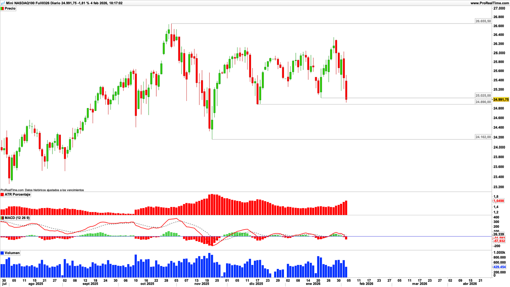 Futuro Mini NASDAQ 100 (NQ) en escala diaria con volatilidad (gráfico central superior), MACD (gráfico central inferior) y actividad de contratación (ventana inferior). Fuente: ProRealTime y elaboración propia.