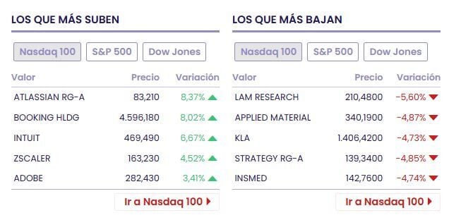 Entre las acciones perdedoras tenemos a Lam Research (-3.73% a 214.68 dólares), CIENA (-12.94% a 299.08 dólares) y Caterpillar (-3.56% a 705.90 dólares)