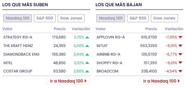 Entre las acciones perdedoras tenemos a AppLovin Rg-A (-7.61% a 617.76 dólares), Intuit (-6.38% a 566.69 dólares) y Microsoft (-2.31% a 459.80 dólares)