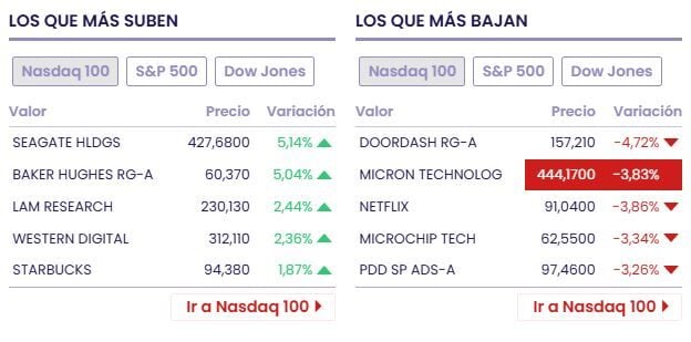 Entre las acciones ganadoras tenemos a Seagate Hldgs (+6.91% a 434.87 dólares), Baker Hughes Rg-A (+5.67% a 60.74 dólares) y Chevron (+1.41% a 201.41 dólares)