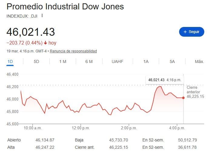 El conflicto en Medio Oriente sigue poniendo a los mercados al rojo vivo, es que Irán e Israel ha hecho ataques a sus infraestructuras energéticas claves. Lo que avivado los temores al aumento de la inflación ante el incremento del precio del petróleo. Esto se da tras la reunión de la Reserva Federal (FED) de ayer donde los tipos de interés se mantuvieron sin cambios. Lo que ha dejado al DOW JONES Ind Average, S&P 500 y NASDAQ 100 cayendo al cierre del jueves en un -0.44% a 46.021 puntos, -0.27% a 6.606 puntos y -0.28% a 22.090 puntos respectivamente.