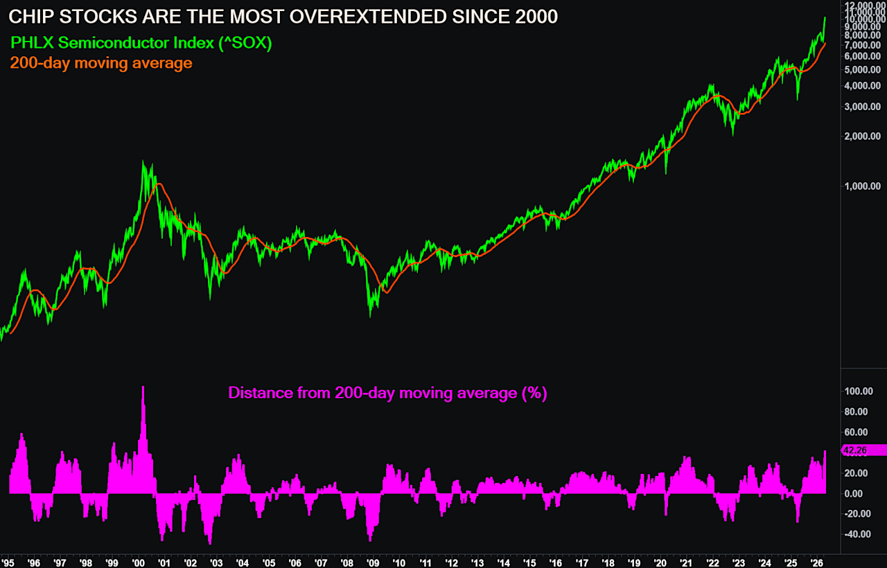 ¿Cuál es el problema? El índice SOX se encuentra ahora en su nivel más elevado por encima de su media móvil de 200 días desde el año 2000, lo que nos recuerda que la reversión a la media puede producirse rápidamente en el sector más dinámico del mercado.