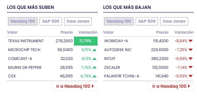 Entre las acciones ganadoras tenemos a Texas Instrument (+19.43% a 282.23 dólares), United Rentals (+22.94% a 986.91 dólares) y Caterpillar (+3.24% a 835.10 dólares)