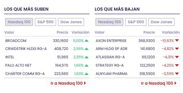 Entre las acciones ganadoras tenemos a Broadcom (+6.21% a 333.97 dólares), Unitedhealth Gro (+9.37% a 307.72 dólares) y Chevron (+1.35% a 201.54 dólares)