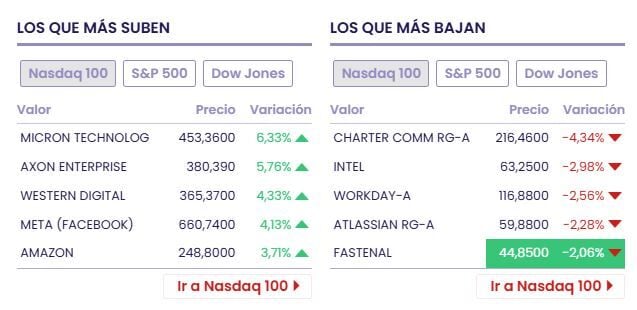 Entre las acciones ganadoras tenemos a Micron Technolog (+9.11% a 465.42 dólares), Robinhood Mkts Rg-A (+10.36% a 79.10 dólares) y Amazon (+3.79% a 248.97 dólares)