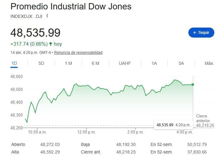El mercado sigue pendiente de lo que suceda en torno al conflicto en Medio Oriente. Por ello se mantiene el optimismo por una tregua a largo plazo tras las declaraciones de Donald Trump de mantenerse abierto a nuevas conversaciones con Irán. Aunque manteniendo el bloqueo en el Estrecho de Ormuz. Sin olvidar que los precios al productor subieron lentamente con respecto al mes anterior. Por ello el DOW JONES Ind Average, S&P 500 y NASDAQ 100 suben al cierre del martes un +0.66% a 48.535 puntos, +1.18 a 6.967 puntos y +1.96% a 23.639 puntos respectivamente.