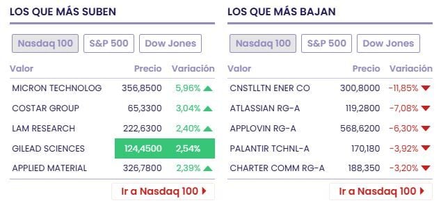 Entre las acciones ganadoras tenemos a Micron Technolog (+7.78% a 362.83 dólares), Super Micro (+11.01% a 32.66 dólares) e IBM (+2.64% a 305.83 dólares)