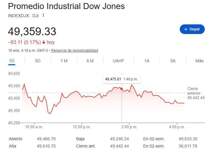 Las tensiones geopolíticas procedentes de Washington siguen imponiéndose en bolsa. Es que tras el conflicto con Venezuela la semana pasada, esta le tocó el turno a Groenlandia e Irán. Sin olvidar las tensiones con Jerome Powell, presidente de la Reserva Federal (FED). Todo esto en un inicio de temporada de resultados positiva, dejando al DOW JONES Ind Average, S&P 500 y NASDAQ 100en territorio bajista al cierre semanal con un -0.17% a 49.359 puntos, -0.08 a 6.939 puntos y -0.07% a 25.529 puntos respectivamente.