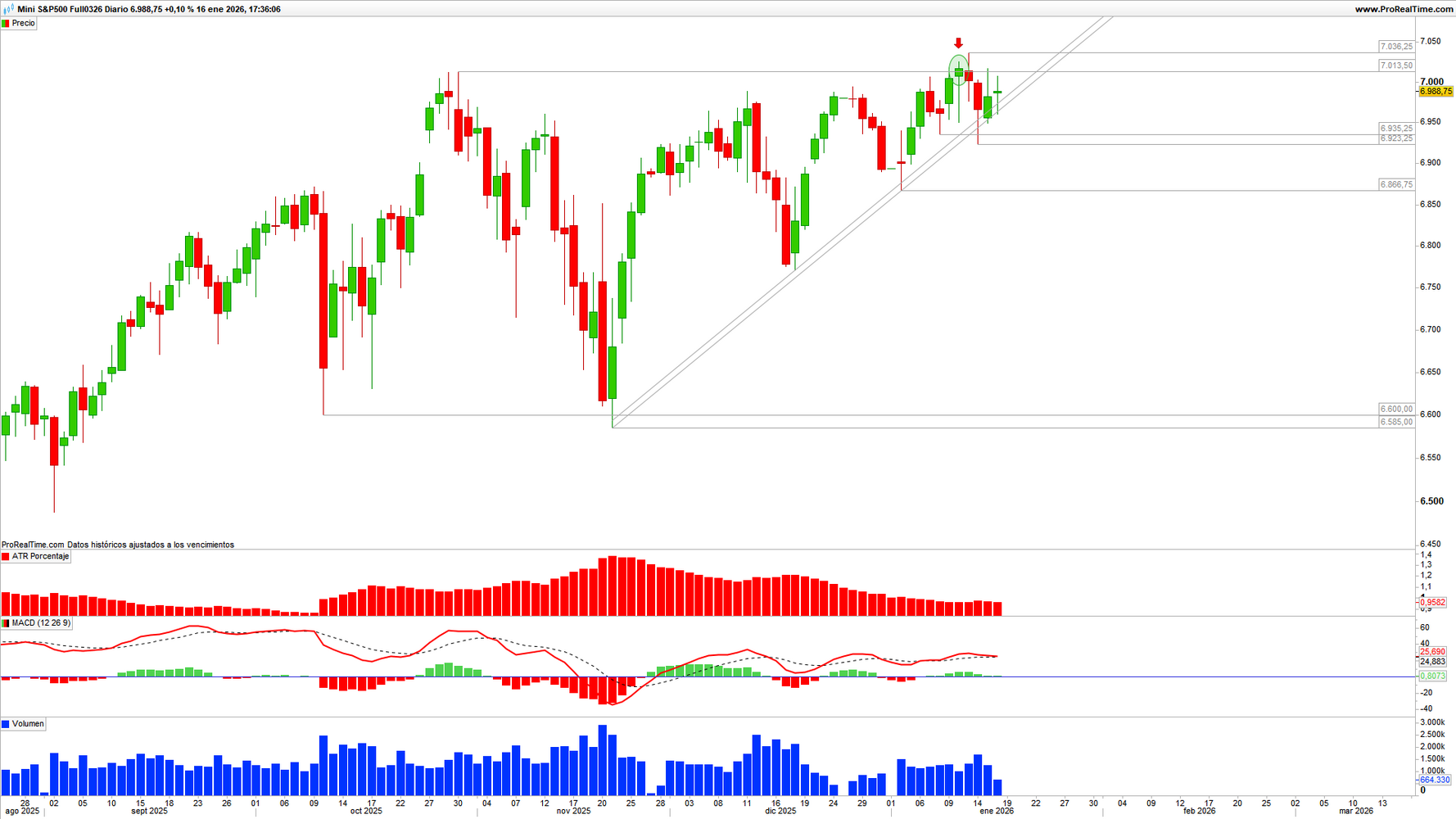 El ruido de mercado aumenta a lo largo de las últimas jornadas de cotización, y lo hace tras haber logrado un cierre de vela diaria por encima de la resistencia proyectada a partir de los 7.013 puntos el pasado lunes 12 de enero. Lo anterior evidencia un aumento en las dudas en cuanto a la validación de superación de resistencias significativas se refiere, pues tan solo una sesión después de superar la resistencia citada el mercado intentó continuar avanzando pero sin éxito, lo que nos dejó un nuevo máximo anual en los 7.036 puntos en el Futuro Mini S&P 500.
