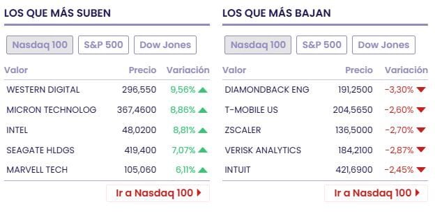 Entre las acciones ganadoras tenemos a Western Digital (+10.06% a 297.70 dólares), Micron Technolog (+8.87% a 367.79 dólares) y Boeing Co (+4.20% a 207.38 dólares)