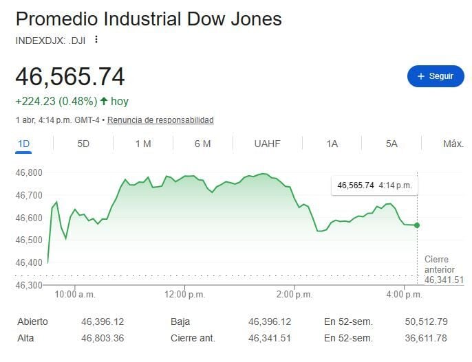 El conflicto en Medio Oriente fue el principal plató durante todo el mes de marzo llevando el precio del petróleo por encima de los 100 dólares. Tras idas y vueltas, pareciera que podría haber una solución diplomática del conflicto tras las declaraciones de Donald Trump y su par iraní Masoud Pezeshkian. No obstante, Wall Street no se quita del todo la incertidumbre pero el DOW JONES Ind Average, S&P 500 y NASDAQ 100 cierran al alza en un +0.48% a 46.565, +0.72% a 6.575 puntosy +1.16% a 21.840 puntos respectivamente.