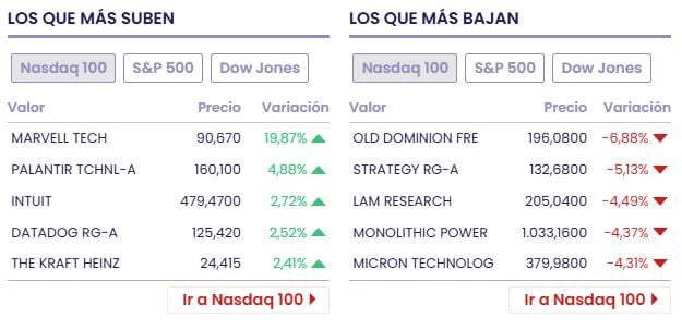 Entre las acciones ganadoras tenemos a Marvell Tech (+18.35% a 89.57 dólares), CF Industries Hl (+4.50% a 115.77 dólares) y Boeing Co (+4.07% a 231.10 dólares)