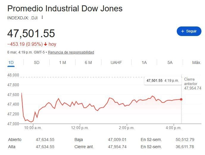 La primera semana de marzo quedará para el olvido en Wall Street. Es que el mercado se ha resentido tras los datos de empleo no agrícola cayendo en 92.000 puestos de trabajo frente una expectativa de 55.000 nuevos puestos de trabajo. A ello debemos sumarle el incremento del precio del petróleo, tanto el WTI como Brent, por el conflicto en Medio Oriente con el cierre del Estrecho de Oromuz. Esto ha conllevado a un cierre del viernes y semanal en rojo para el DOW JONES Ind Average, S&P 500 y NASDAQ 100 en un -0.95% a 47.501 puntos, -1.33% a 6.740 puntos y -1.59% a 22.387 puntos respectivamente.