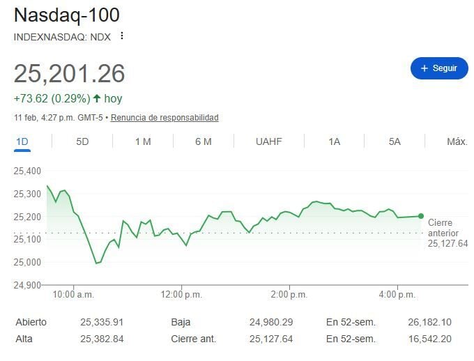 El mercado no recibió de muy buen agrado los datos de empleo de la Oficina de Estadísticas Laborales de enero con 130.000 puestos y una disminución de la tasa de desempleo de 4.4% a 4.3%. Este dato ha cambiado los pronósticos sobre la próxima decisión de tipos de interés de la Reserva Federal (FED), ya que ahora se espera que mantenga los mismos en los próximos meses. Lo que dejó una reacción mixta de los principales índices de Wall Street con el DOW JONES Ind Average, S&P 500 y NASDAQ 100 cerrando con un -0.13% 50.121 puntos, -0.01% a 6.941 puntos y +0.29% a 25.201 puntos respectivamente.