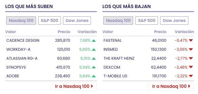 Entre las acciones ganadoras tenemos a Cadence Design (+8.51% a 288.27 dólares), Oracle (+12.71% a 155.64 dólares) y Salesforce (+4.73% a 172.77 dólares)