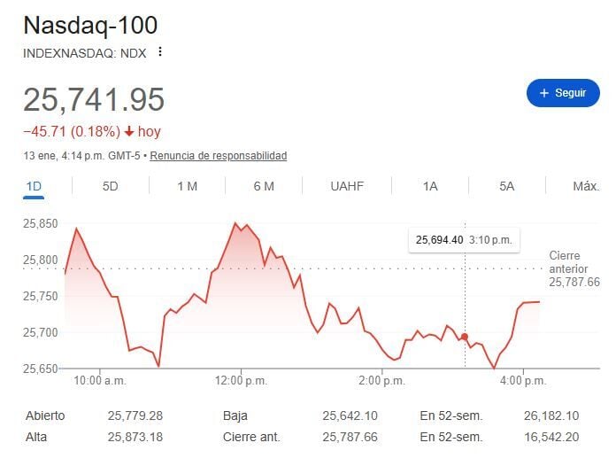 Malas noticias para Wall Street este martes con el DOW JONES Ind Average, S&P 500 y NASDAQ 100 tiñendo el cierre de la sesión en rojo un -0.80% a 49.191 puntos, un -0.22% a 6.962 puntos y un -0.18% a 25.741 puntos respectivamente. . ¿La razón? El IPC de diciembre dejó una tasa general anual del 2.7% y una tasa mensual del 0.2%. Lo que ha reforzado la expectativa de que la Reserva Federal (FED)mantenga los tipos de interés en la reunión de enero. Mientras, JPMorgan Chase era el centro de la atención tras la presentación de resultados del 4to trimestre 2025, aunque siendo una de las acciones perdedoras al cierre de la sesión.