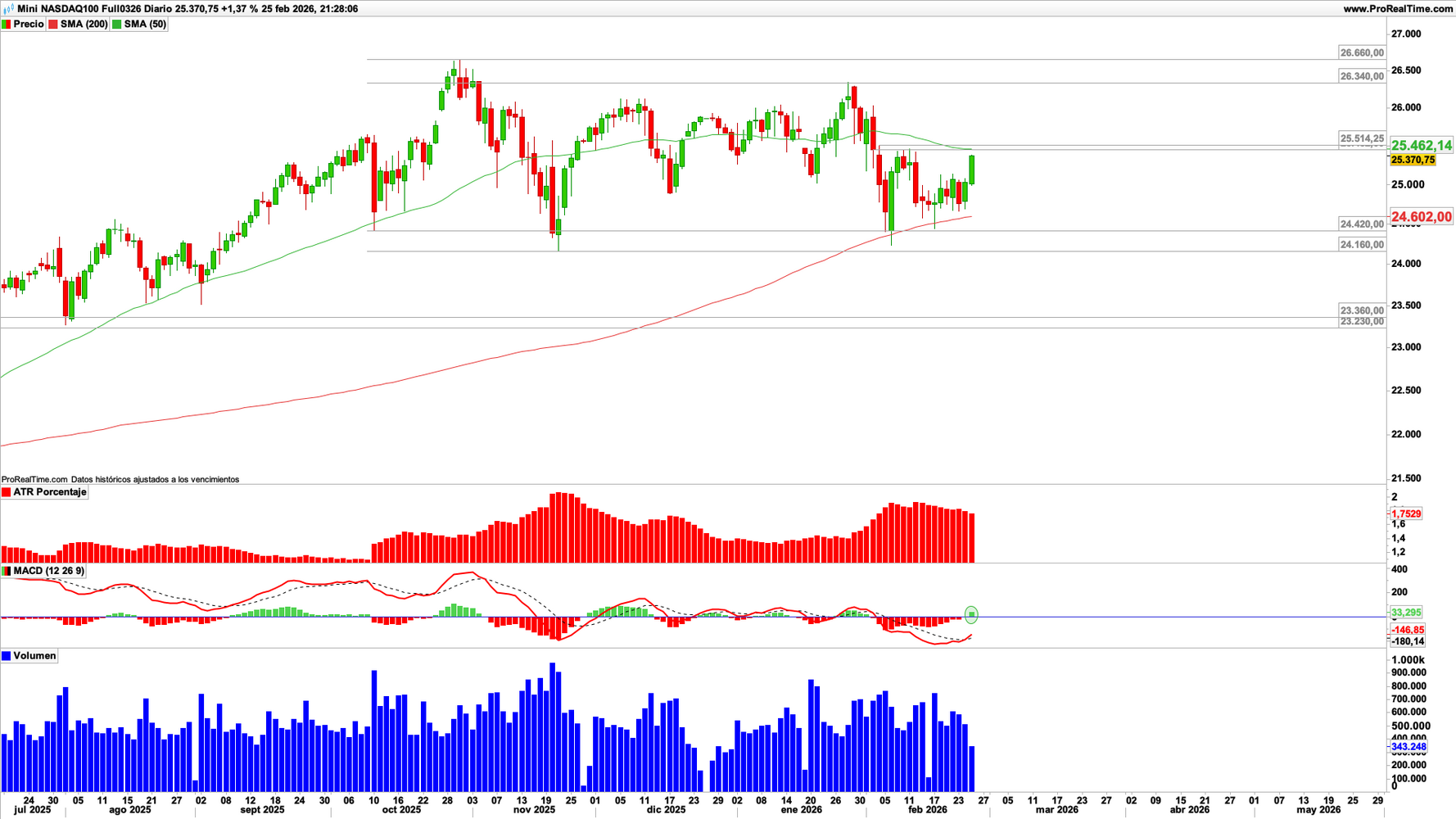 Futuro Mini NASDAQ 100 (NQ) en escala diaria con volatilidad (gráfico central superior), MACD (gráfico central inferior) y actividad de contratación (ventana inferior). Fuente: ProRealTime y elaboración propia.