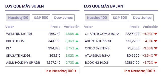 Entre las acciones ganadoras tenemos a Western Digital (+6.85% a 262.06 dólares), Sandisk (+11.64% a 588.73 dólares) y Caterpillar (+3.54% a 704.99 dólares)