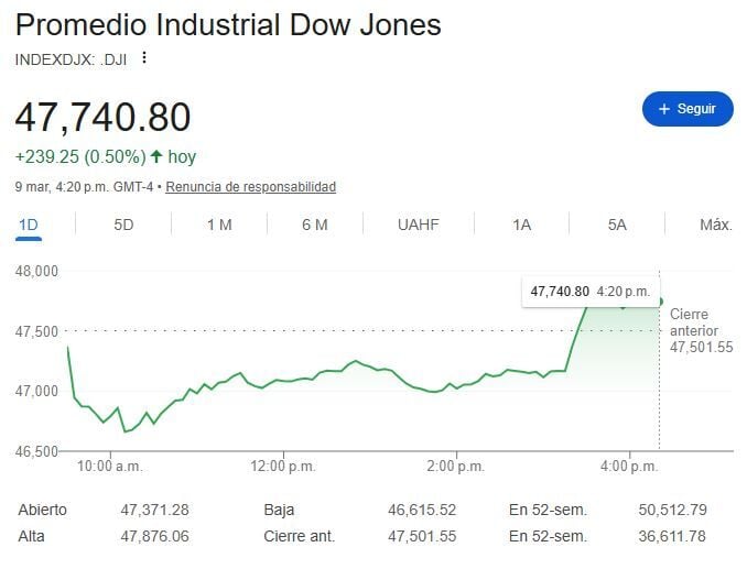 Wall Street empieza la semana con preocupación tras el repunte del precio del petróleo por encima de los 100 dólares, aunque con un posterior retroceso, debido al conflicto en Medio Oriente y sus implicaciones en la economía mundial. A pesar de ello el DOW JONES Ind Average, S&P 500 y NASDAQ 100 suben al cierre en un +0.50% a 47.740 puntos, +0.83% a 6.795 puntos y +1.38% a 22.695 puntos respectivamente.