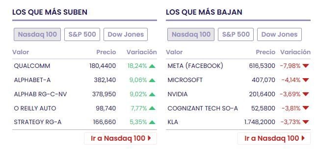 Entre las acciones ganadoras tenemos a Qualcomm (+15.09% a 179.54 dólares), Quanta Services (+15.81% a 727.99 dólares) y Caterpillar (+9.90% a 890.26 dólares)