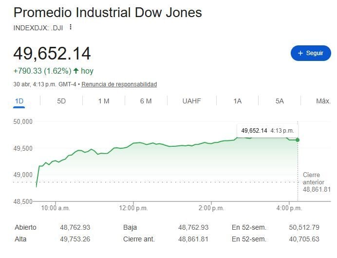 Este jueves la atención se ha centrado en los resultados de cuatro de los “Siete Magníficos”. Es que Alphabet-A, Amazon, Microsoft y Meta (Facebook) superaron las estimaciones de los analistas. Lo que ha demostrado que el gasto en inteligencia artificial o IA no se ha desacelerado. Se espera que Apple realice su presentación tras el cierre del mercado. Ante ello el DOW JONES Ind Average, S&P 500 yNASDAQ 100cierran el jueves al alza en un +1.62% a 49.652 puntos, +1.02% a 7.209 puntos y+0.89% a 24.892 puntos respectivamente.