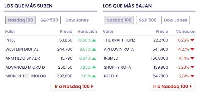 Entre las acciones perdedoras tenemos a The Kraft Heinz (-5.72% a 22.40 dólares), AppLovin Rg-A (-5.83% a 532.56 dólares) y Microsoft (-2.29% a 444.11 dólares)