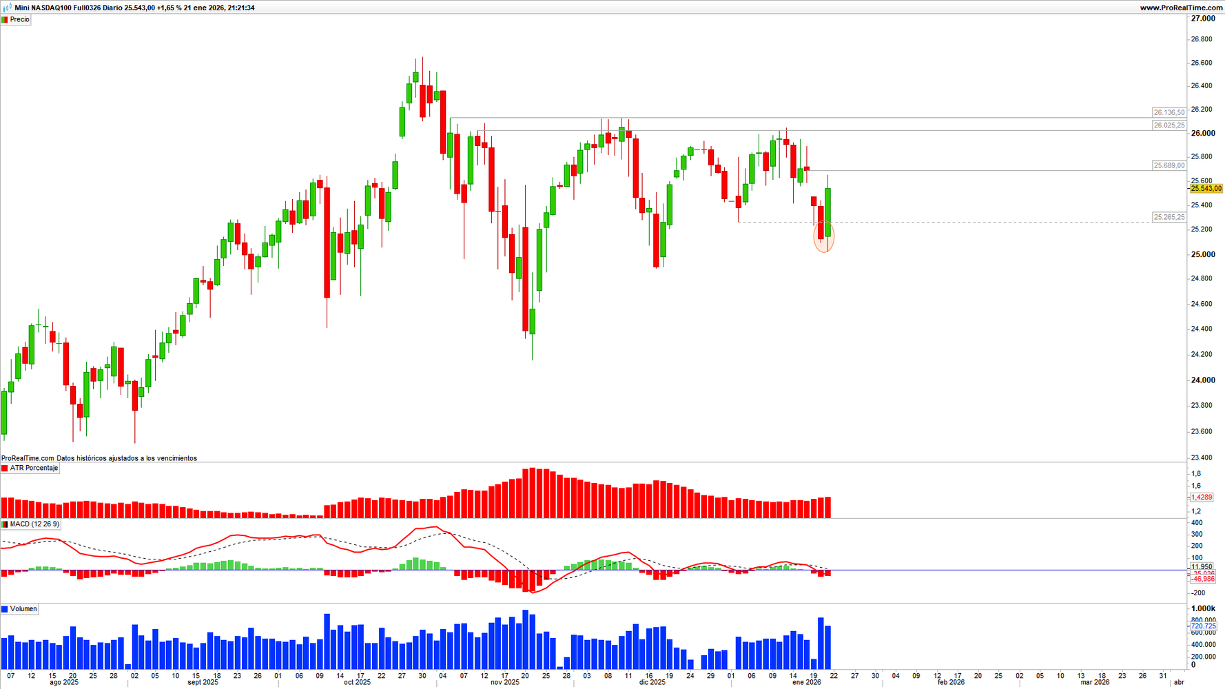 Futuro Mini NASDAQ 100 (NQ) en escala diaria con volatilidad (gráfico central superior), MACD (gráfico central inferior) y actividad de contratación (ventana inferior). Fuente: ProRealTime y elaboración propia.