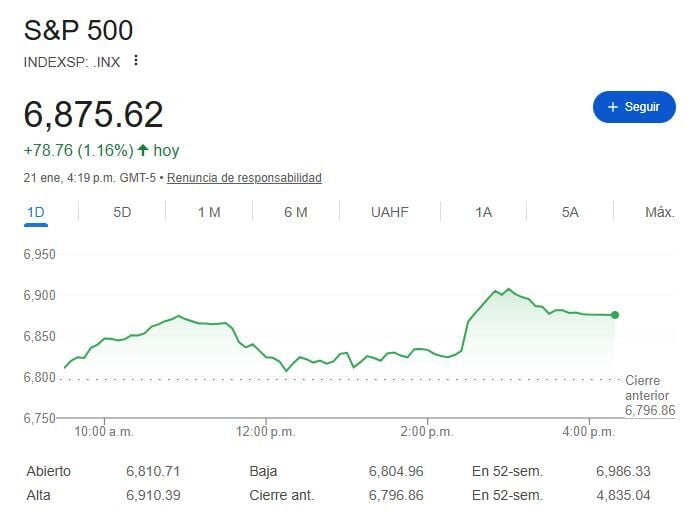 La geopolítica sigue marcando la dirección del mercado bursátil este miércoles. Es que en el Foro Económico Mundial de Davos, Donald Trump ha señalado que no usará la fuerza para hacerse con Groenlandia y pidió “negociaciones inmediatas” con los líderes europeos. Los cuales han mostrado todo su apoyo a Dinamarca y que tomaran medidas de ser necesario. Ante ello, el DOW JONES Ind Average, S&P 500 y NASDAQ 100 registran subidas hasta los +1.21% a 49.076 puntos, +1.16% a 6.875 puntos y +1.36% a 25.326 puntos respectivamente.