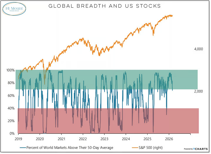 Siguiendo con los coletazos de febrero, el porcentaje de mercados mundiales que alcanzaron nuevos máximos en dicho mes se redujo y, por primera vez este año, menos del 70% de los mercados globales se sitúan por encima de sus medias de 50 días.